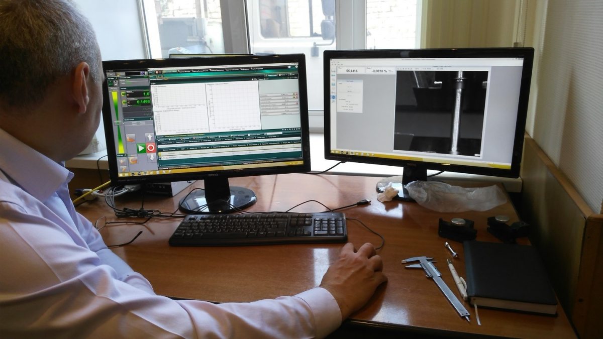 - Демонстрация универсальной испытательной машины в комплексе с бесконтактным датчиком измерения деформации - видеоэкстензометром